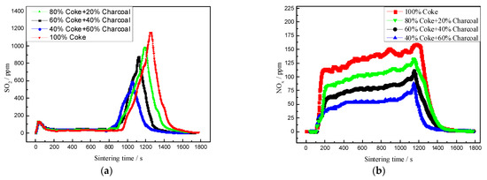 Effects of charcoal on the SO2 and NOx content in flue gas. (a) SO2 emission curve; (b) NOx emission curve.