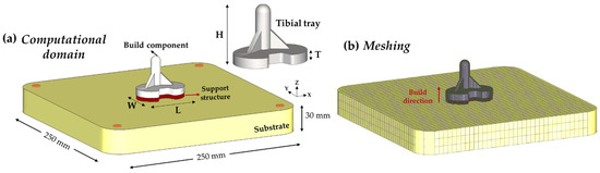 The Simufact Additive software, which is a scalable software solution for the metal additive manufacturing processes, requires the input of inherent strain values () for calculation and prediction of the residual stress and part distortion. For the study, the inherent strains are acquired from the previous research of Siewert et al. [47]. Bidirectional scanning pattern is applied to build the twin-cantilever beam in the calibration process. The inherent strain values were calibrated by measuring cantilever distortion after cutting, and then the simulation model was calculated to match the experiment value. The inherent strain values in the X, Y, and Z directions are = −0.0047, = −0.0020, and = 0. The additional description of this calibration process can be found from [47]. Figure 2a shows the computational domain which consists of the build component, support structure, and substrate plate. Figure 2b shows the meshing of the computational domain.