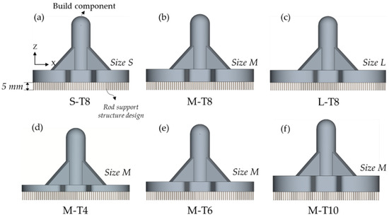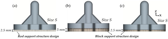 The tibial components of all case studies were placed in the middle of the computational domain. The distance between the tibial component and substrate top surface of all cases was 5 mm. To explore the size effect on distortion in this study, rod support-structure design was used in all cases. The rod support radius was 0.3 mm, and the distance between each rod was 0.6 mm. The present study utilized voxel mesh number between 0.5 and 1.5 million elements. The initial temperature conditions were 298 K. The bottom of the substrate plate was set with zero displacement. As a result, the substrate is not allowed to move freely when the build components are produced. Figure 3 exhibits each size of the tibial component on the rod support. Table 2 presents the dimensions of the tibial components used in this study. The tibial component size S on the different support-structure designs is shown in Figure 4.