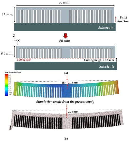 (a) The twin-cantilever beam with cutting path; (b) the comparison of the twin-cantilever beam distortion between simulation result obtained from the present study and the experimental study from Siewert et al. (experiment measurement modified from Siewert et al. [47]. Reproduced with license 5362460533296. Copyright 2022 Elsevier. (h) is the distance of the part’s middle point on the surface to a line.