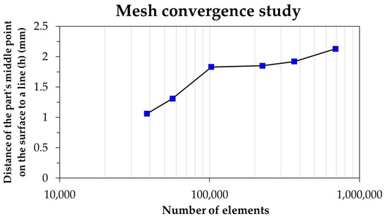 Mesh convergence analysis was initially performed to evaluate the influence of the number of elements on the simulation results and to obtain the reliability of the numerical model. The twin-cantilever beam with dimensions of 7.5 mm (width) × 80 mm (length) × 13 mm (height) was used as a specimen, as illustrated in Figure 6a. The mesh convergence analysis was carried out by comparing the deflection measured at the middle point of the specimen, as illustrated in Figure 6b. The element sizes for the analysis were 0.6, 0.5, 0.4, 0.3, 0.25, and 0.2 mm. Each element size provided a total number of elements of 38,117, 56,691, 102,699, 224,901, 367,461, and 693,409, respectively. As illustrated in Figure 7, the simulation result can converge when the number of elements is greater than 100,000 elements. As a result, the element size of 0.25 mm was selected to further study the influence of part sizes and support-structure designs on the distortion of tibial component. In addition, to verify and obtain the accuracy of the numerical model implemented in this research, the result from numerical modeling in the present study was verified against the experiment from Siewert et al. [47]. Firstly, the twin-cantilever beam specimen as shown in Figure 6a has been printed with layer-by-layer addition. Then, the cantilever beam was removed from the substrate, where the deflection was seen due to the effect of stress relaxation. Figure 6b illustrates the comparison of the twin-cantilever beam distortion between the simulation result obtained from the present study and the experimental measurement from Siewert et al. [47]. It was found that the numerical result and the experiment result were in good agreement, with minor difference of 10.3%. Hence, the present numerical model can be used to investigate the distortion of the tibial component of the present study.