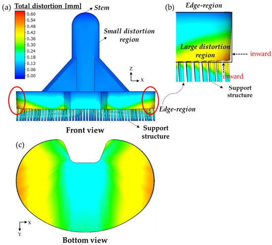 Figure 8 shows the total distortion distribution of the as-built S-T8 tibial component. The numerical results revealed that the large distortion occurred near the interface between the tibial tray and support structure. This is mainly due to the different stiffness of solid bulk and support structure. The maximum distortion arose around both edges of the long side of the tibial tray, which is marked in the red circles in Figure 8a. This region tended to be more susceptible to cracking. Meanwhile, the small distortion magnitude took place at the stem region and top surface of the tibial tray (blue region). In addition, it was noticed that the distortion magnitude gradually mitigated from the edge to the inside, as displayed in Figure 8c. Figure 8b amplifies the distortion at the edge region. It was observed that the distortion magnitude gradually decreased from the bottom surface at the interface to the top surface of the tibial tray because the constraint strength provided by the support structure decreased when the deposition height was increased. The black solid line in Figure 8b demonstrates the original shape of the tibial component.