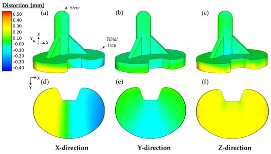 Figure 9 exhibits the distortion distribution in each direction of the as-built S-T8 tibial component. The magnitude of distortion of the built component is represented by a color contour plot. The result revealed that the distortion distribution of the tibial component was different in each direction. According to the distortion distribution in the X-direction, the tibial component distorted inwardly at both edges of the tibial tray. The value of maximum distortion in the X-direction was around 0.34 mm, while the distortion value in the Y-direction was relatively less where its maximum magnitude was around 0.07 mm. It can be seen that the distortion magnitude in the Z-direction, which was along the build direction, was higher than that in the X- and Y-directions. The maximum distortion magnitude in the Z-direction was around 0.43 mm.