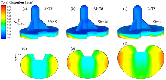 Total distortion of the as-built tibial component with different sizes. (a,d) Small size with 8 mm thickness (S-T8); (b,e) Medium size with 8 mm thickness (M-T8); (c,f) Large size with 8 mm thickness (M-T8).