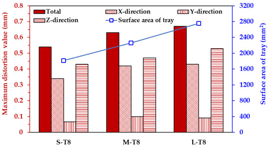 The results indicated that the distortion of the tibial component tends to increase with larger size according to the surface area of the tibial tray. This is due to the shrinkage of the component that was approximately proportional to the part size and the influence of constraining strength between the built component and support structure [39,49]. As shown in Figure 11, the maximum total distortions of the tibial component of S-T8, M-T8, and L-T8 were 0.54 mm, 0.63 mm, and 0.67 mm, respectively. It can be noticed that when the component size was increased from small size (S) with the tibial tray surface area of 1815 mm2 to medium size (M) with the tibial tray surface area of 2262 mm2 and large size (L) with the tibial tray surface area of 2754 mm2, the maximum total distortion was increased by 16.7% and 24.1% respectively. It was also discovered that the distortion in the Z-direction is more dominant than that in the X- and Y-directions. A similar result was also reported by Shi et al. [50].