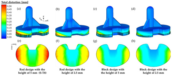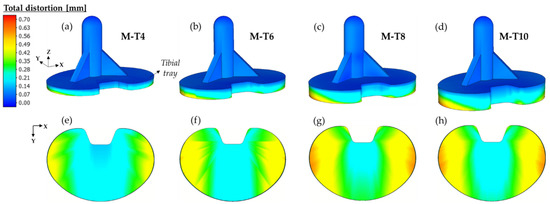 The total distortion at the as-built stage of medium-size tibial component with different tray thickness. (a,e) Medium size with 4 mm thickness (M-T4); (b,f) Medium size with 6 mm thickness (M-T6); (c,g) Medium size with 8 mm thickness (M-T8); (d,h) Medium size with 10 mm thickness (M-T10).