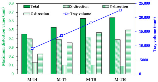 Figure 13 illustrates the maximum distortion of the as-built tibial component with different tray thickness. The maximum total distortion value of the tibial component fabricated with different thicknesses of the tibial tray was 0.45 mm for M-T4, 0.53 mm for M-T6, 0.63 mm for M-T8, and 0.64 mm for M-T10. It was noted that when the thickness of the tray increased from 4 mm (M-T4) with tray volume of 9049 mm3 to 6 mm (M-T6) with tray volume of 13,573 mm3, 8 mm (M-T8) with tray volume of 18,097 mm3 and 10 mm (M-T10) with tray volume of 22,622 mm3, the maximum total distortion value of the tibial component was increased by 17.3%, 39.4%, and 41.6% respectively. This is because of the decrease in constraint strength with an increase in the thickness of the tibial tray.