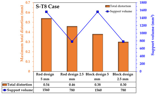 The maximum total distortion of the S-T8 tibial component fabricated with different support structures.