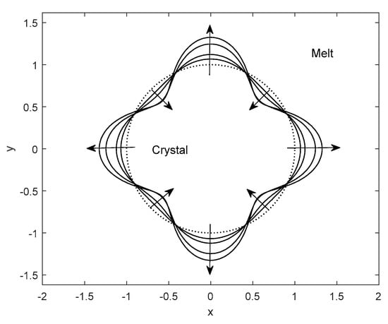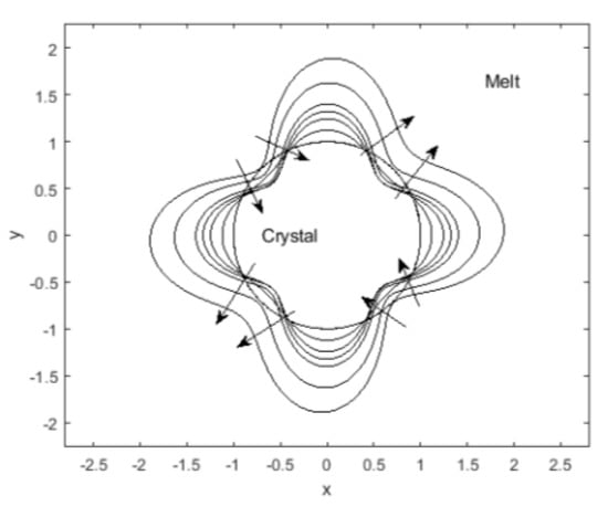 Figure 1, Figure 2, Figure 3 and Figure 4 show the interface morphologies of a columnar crystal growing in an undercooled melt under the influence of an anisotropic interface energy and forced flow. Figure 1 shows the cross-sectional curves of the interface morphology of a columnar crystal growing in an undercooled melt under the influence of anisotropic interface energy. It is seen that during the initial growth times from to , some part of the interface of the columnar crystal in the <110> growth directions decays inwardly, whereas the other part of the interface grows outwardly in the <100> preferred growth directions.