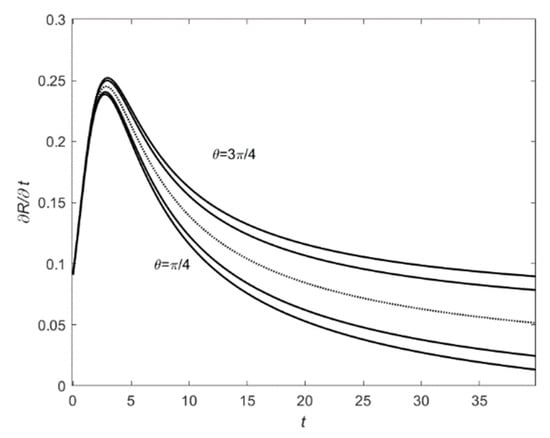 From Equation (46), as , , the columnar crystal decays, whereas as , , the columnar crystal grows. Setting yields a critical value of . Returning to the dimensional quantity of the critical value , we define the critical nucleation radius of the columnar crystal as