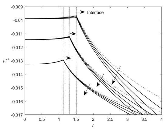 It is easily testified that the asymptotic solution in (59)–(61) does not satisfy the initial conditions for the temperature fields. This is caused by the early-time behavior of crystal growth from the assumption . In order to solve for the early-time behavior, we introduce the fast time variable and seek the inner solution with respect to time (see Appendix B). Consequently, we can match the inner solution with the solution in Equations (58)–(62) and obtain the uniformly valid asymptotic solution of the columnar crystal growth in the whole melt region. Since the phase transformation occurs near the interface, the asymptotic solution in (59)–(61) shows the variations in the temperature and the interface of the columnar crystal during the growth of the columnar crystal.