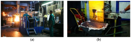 Foundry during the production phases: (a) the cast iron descends from the cupola furnace (not visible) through the sprues to the secondary furnace, and then into the ladle (in the foreground); (b) chemical composition tests conducted by measuring the cooling curves (performed by an operator taking the melt directly from the ladle and pouring it into the instrument).