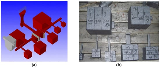 Casting details: (a) “cluster of cubes”, geometry of the sand mold with cubes of different sizes (i.e., 50, 75, 100, 120, 150, 180, 210 mm) formed by Procast; (b) solidified metal cubes, separated and with indications of the cutting directions.
