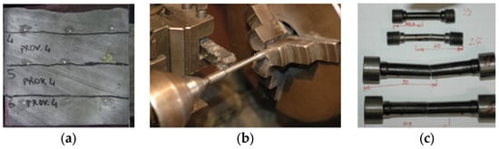 Different phases of the production and testing of the standardized specimens: (a) splitting of the cube into specimens; (b) machine tool processing of the ‘dog bone’ shapes; (c) specimens after failure.