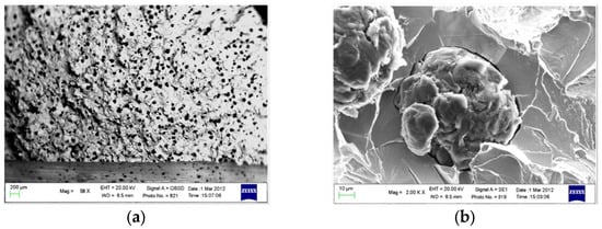 Micrograph details: (a) a completely nodular area (58×); (b) the spherical morphology of the graphite nodules (2000×).