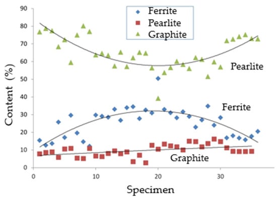 Ferrite, pearlite and graphite contents with respect to each specimen.
