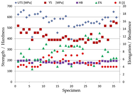 Mechanical properties of the UTS (MPa), YS (MPa), HB, ε (%) and R (J) for each specimen.