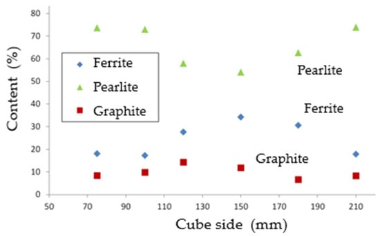 Ferrite, pearlite and graphite average contents of specimens from the same cube side.