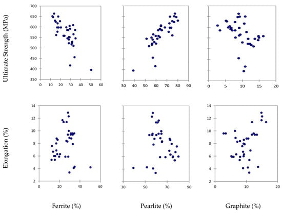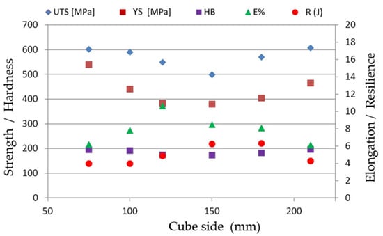 The same data can also be grouped according to the representative size of the casting from which the specimens were extracted (cube side), as in Figure 7 and Figure 8, and/or investigated in terms of the relationships between the material characteristics (both mechanical and microstructural), as in Figure 9, Figure 10 and Figure 11. Considering these trends, some aspects seem to be evident, and others less so. For instance, the increase in the ferrite and the decrease in perlite as the size of the cube increases can easily be associated with the increase in the cooling time required. At this point, however, the trend reversal after 150 mm becomes less clear, indicating that the phenomena under investigation may lose linearity over the range of interest.
