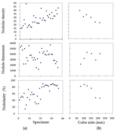 Microstructural information about the graphite nodules (such as the density, dimension and nodularity) in the case of: (a) a single specimen, (b) average values of specimens from the same cube side.
