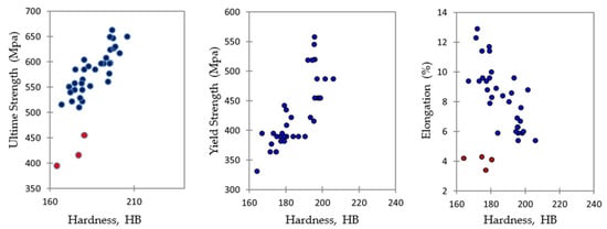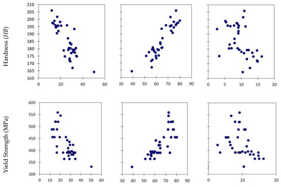 Nevertheless, even more relevant studies are those related to the prediction of mechanical properties in the case of cast irons, starting with their metallurgy characteristics. Firstly, it is interesting to mention [], where ML algorithms properly classified nodular cast irons, while this ability was used to predict (by regression) the stress–strain [], Poisson’s ratio [] and hardness [], even when comparing different ductile cast alloys [].