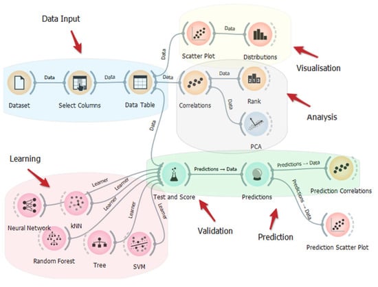 - Demšar, J.; Curk, T.; Erjavec, A.; Gorup, Č.; Hočevar, T.; Milutinovič, M.; Možina, M.; Polajnar, M.; Toplak, M.; Starič, A.; et al. Orange: Data mining toolbox in Python. J. Mach. Learn. Res. 2013, 14, 2349–2353. [Google Scholar]