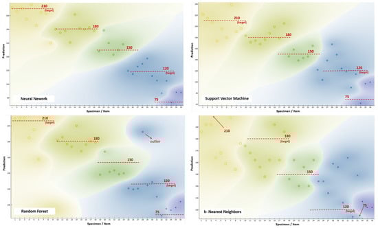 Returning to data mining applications for SGI, in [], the k-nearest neighbors (kNN) learner, another supervised classifier, was used to predict defects in a foundry by relating historical process data (about the mold sand, pouring process, chemical composition, etc.) to the percentage of defective castings. This is a valid example regarding the use of ML for monitoring the quality of the casting process in the case of SGI, but it required a large amount of data in order to define the time series from which one can recognize the time-depending patterns. Thus, the present work is very different in terms of its data consistency and scope.