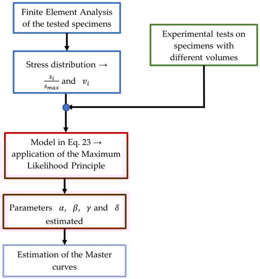 being . According to Equation (21), the scale factor is a function of , which in turn depends on . Accordingly, data obtained through tests on specimens with different volumes can be considered together and collapsed into a unique ‘master curve’. With easy passages, the equivalent stress can be finally expressed as:
