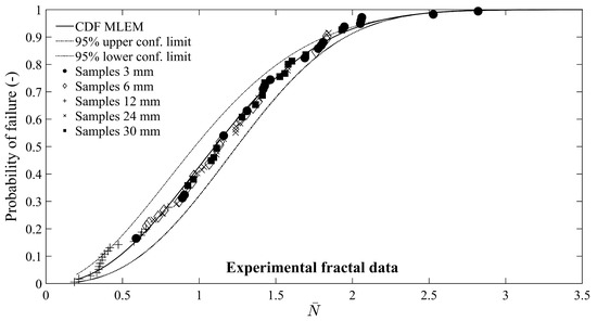 Subsequently, the application of the maximum likelihood method provided the values of the two parameters of the Weibull distribution, i.e., and , which was expressed in terms of the random variable . The random variable is given by dividing the experimentally observed number of cycles by the median fatigue life predicted by Equation (9). Table 1 shows the values of the five free-parameters entering Equation (6) with the corresponding 95% confidence intervals, whereas Figure 2 shows the estimated CDF for the fractal experimental data.