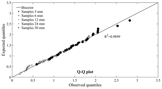 where M is the sample size. If the assumed CDF is appropriate, the data in the Q-Q plot should be roughly linear and follow the bisector of the first quadrant. Figure 3 depicts the Q-Q plots for the whole experimental dataset. From Figure 3, it can be observed that there exists a good agreement between the normalised VHCF life deriving from the model and the experimental ones. In fact, the Q-Q plot shows that the experimental data are distributed along the bisector of the first quadrant, with a high correlation coefficient, , equal to 0.9899. Thus, the Q-Q plot provides further confirmation that the experimental data can be described by the two-parameter Weibull distribution.