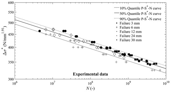 This equation implies that, the larger the specimen dimension, the lower the VHCF strength, being N and P the same. In addition, if Equation (1) is substituted into Equation (6), the nominal VHCF resistance is replaced by the corresponding fractal quantity, so that the set of specimen-size dependent P-S-N curves collapse onto a single specimen-size independent fractal stress-life, P-S*-N, curve: