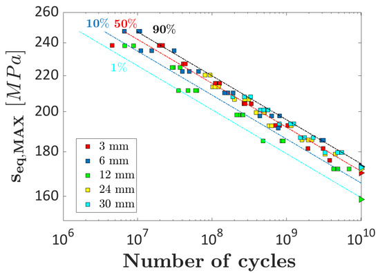 According to Figure 6, the estimated curves are in good agreement with the experimental data. By considering the equivalent stress, the experimental failures are properly collapsed into a unique curve. The experimental failures are concentrated close to the median curve and the scatter is limited, with all the data except two above the quantile curves.