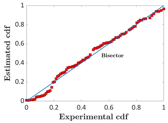 Figure 7 shows the Probability-Probability (P-P) plot of the investigated data. The abscissa axis is the experimental CDF, whereas the ordinate axis is the CDF estimated with the proposed method. The experimental CDF has been computed with the Kaplan-Meier estimate of the empirical cumulative distribution function. The experimental data together with the bisector are shown in Figure 7.