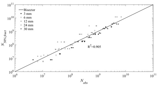 Median fatigue life predicted by the statistical model () versus the experimentally observed number of cycles ().