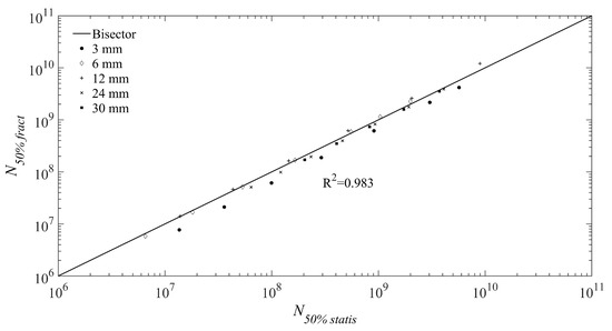 In addition, the two proposed models are further compared between them in Figure 10. In this diagram, the values of the median number of cycles estimated by the statistical model are plotted versus the predicted ones by the fractal approach ().