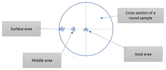 To analyze the hardenability, samples with a length of 150 mm were heated in a laboratory tube resistance furnace SUOL-0.4.4/12 (Tulaterm, Tula, Russia) to the selected research temperature for 15 min, followed by holding for 45 min, and then quenched into oil. Cylinders with a height of 5 mm and a diameter corresponding to rolled products were cut from the obtained samples from the middle along the length, and microsections were made to study microhardness using a Struers Duramin-20 tester (Struers ApS, Copenhagen, Denmark). Vickers microhardness was measured in three different areas of the microsection, according to the scheme shown in Figure 1.