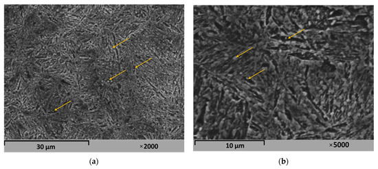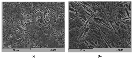 Microstructure of a round-rolled sample from 40KhN2MA grade steel after austenitization at a temperature of 850 °C for 45 min and subsequent oil quenching: (a) magnification ×2000 and (b) magnification ×5000.