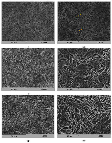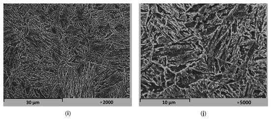 Microstructure of a round-rolled sample made of 40KhN2MA grade steel after quenching and tempering for 1 h at a temperature of: (a,b) 400 °C; (c,d) 425 °C; (e,f) 450 °C; (g,h) 500 °C; and (i,j) 550 °C. Arrows point to carbides.