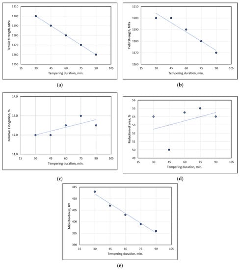 In order to determine the optimal duration of tempering, its influence on the mechanical properties of hot-rolled round bars made of 42CrMo4 steel was studied. The results of the determination of mechanical properties are presented in Table 4 and Figure 4.