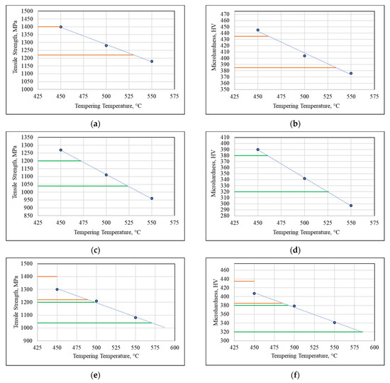 Figure 5 shows the obtained values of tensile strength and microhardness depending on tempering temperature. The horizontal lines represent the upper and lower limits of the tensile strength and Vickers hardness values for fasteners of property classes 12.9 and 10.9. The graphical analysis carried out by the method of linear interpolation made it possible to determine the upper and lower limits of the tempering temperatures at which the required mechanical properties are achieved (Table 6).