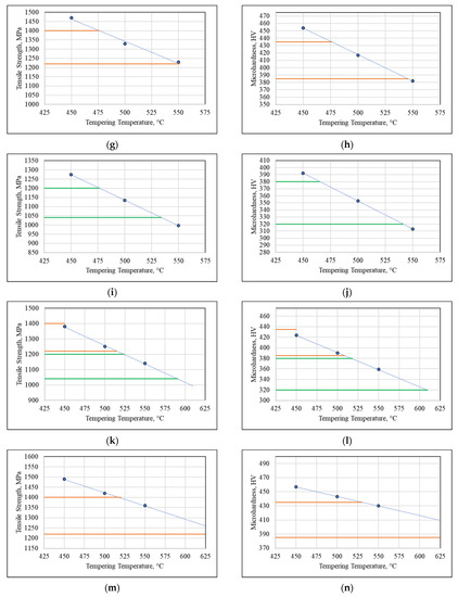 Dependences of the tensile strength and HV hardness on the tempering temperature of rolled products made of steel of grades: (a,b) 42CrMo4; (c,d) 32CrB4; (e,f) 40KhN2MA; (g,h) 34CrNiMo6; (i,j) 31CrMoB2; (k,l) 32KhGMR; and (m,n) 35KhNMFA. Orange horizontal lines correspond to the maximum and minimum values of properties for property class 12.9, green lines correspond to property class 10.9.