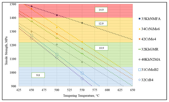 Thus, an analysis was made of the effect of tempering temperature on mechanical properties that meet the requirements of various property classes according to ISO 898-1-2013, for steels of various chemical compositions. Figure 6 shows a summary diagram for the studied steel grades.