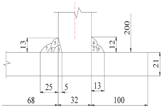 From the point view of the local size of a T-joint of the large diameter of the tank, the T-joint of the tank can be assumed as the T-joint with a plate. The stress distribution of the T-joint of the tank can be approximately regarded as the same as that of the section of the welding test plate. The test plate T-joint is used in this study. The specimens were fabricated using thick plates made of 12MnNiVR low-alloy steel (500 L × 200 W × 32 T mm and 500 L × 200 W × 21 T mm), as shown in Figure 1. The chemical compositions (wt.%) of the base metal and filler metals are illustrated in Table 1, and the chemical compositions of the welding flux are shown in Table 2. Manual arc welding (MAW) and submerged arc welding (SAW) were used for root welding filling and cover welding, respectively. The electrode and welding parameters are shown in Table 3. Pass 1 is the root welding that uses the MAW method with a CHE607CG welding rod, and passes 2–4 (fill welding) and 5–7 (cover welding) use the SAW method with a CHW-S7CG welding rod. This process is widely used in tank welding to improve the welding efficiency to ensure the welding quality. According to the requirements of GB 50661-2011, the preheat temperature was 120 °C, and the inter-pass temperature was about 100 °C, which was achieved by the flame heating method. The welding flux is CHF26H, which should be dried at 350 °C for 1 h before use.