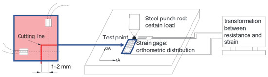 The indentation strain method [22] is one of the most widely used residual stress measurement methods because of its semi-destructive characteristics. The level of load is selected according to the different materials. The diameter of the indentation is 1.2 mm, and the depth is 0.2 mm. The measuring principle is shown in Figure 3. The test positions of the actual path are shown in Figure 4. When the impact load is applied, the impact indentation method adds an additional stress field to the original stress field to relax the residual stress, resulting in a strain increment compared with the specimen without residual stress. The residual elastic strain is calculated according to the relationship between the residual elastic strain and the strain increment under different indentation sizes. The residual stress measured by the indentation strain gauge method is calculated by using Equations (1) and (2) [23]: