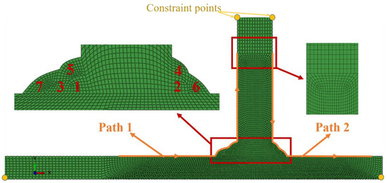 ABAQUS software 6.14-5 was used to calculate the finite element. The 2D axisymmetric model was adopted because of the large size of the storage tank, as shown in Figure 5. The structure and welding sequence are consistent with Figure 2. The dimensions of the bottom plate model, vertical plate model, left seam model, and right seam model are 910 L × 21 T mm, 630 L × 32 T mm, 24 D × 13 H mm, and 13 D × 13 H mm, respectively. The thermal–mechanical coupling model, equivalent heat source, and ideal elastic–plastic model were adopted in the welding process, which are carefully described in Section 3.2. The birth and death technology is used to simulate the shape change of the work piece by deleting and reactivating the mesh or contact pairs and was adopted in this model. Weld passes 1 to 7 were sequentially activated.