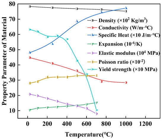 The model has 9138 elements and 9704 nodes. The effect of the quantity of mesh on the residual stress was considered. Figure 6 shows that the residual stress calculated by the number of elements, 9138 and 11,235, is basically consistent; thus, the number of elements, 9138, can ensure the calculation accuracy. The smallest mesh size is 0.64 mm × 0.6 mm. The DCAX4 (4-node linear axisymmetric heat-transfer quadrilateral) thermal element and CAX4R (4-node bilinear axisymmetric reduced-integration) stress element are used in the whole model during thermal and elastic–plastic analyses, respectively. During the welding and PWHT, the thermophysical and mechanical properties vary with temperature. The temperature-dependent material properties of 12MnNiVR, including the mechanical and thermal properties, are considered in the finite element analysis, as shown in Figure 7. Herein, the material properties of the weld and base metals are assumed to be the same. The mechanical properties are obtained from tests, such as the elastic modulus, Poisson’s ratio, and yield strength. The thermal property parameters were calculated using JMatPro software. JMatPro has a powerful metal material database that has been widely verified by experiments. The thermal performance parameters of the material can be obtained by inputting the chemical element composition of the material. The material parameters in the simulation are assumed to be constant when the temperature is above 1400 °C.