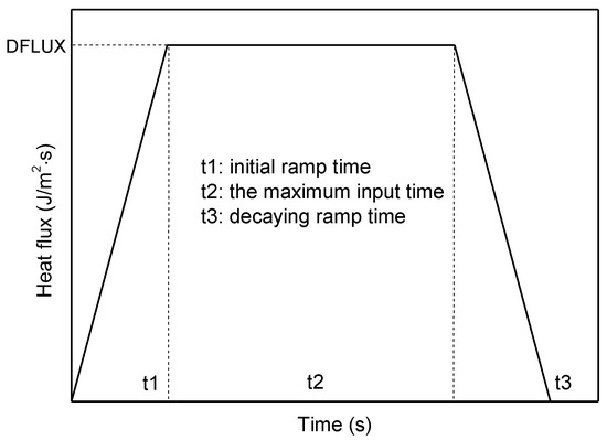 The thermal-elastic-plastic analysis consists of the welding temperature and stress analyses and employs the temperature that was obtained from the thermal analysis. The 2D model with an endogenous heat source has better results and can greatly reduce the computational cost [24]. The welding temperature is simulated by applying a heat flux to the weld elements by using a ramp heat input model. This heat model is described in Ref. [25] in detail, which can be used to model the welding heat source and avoid the numerical convergence problems, as shown in Figure 8. The heat flux varies with time, simulating the movement of the heat source. The weld bead is heated to the maximum heat input within ramp time t1 (i.e., the heat source approaching process). Then, it stays constant until t2 to ensure melting. At last, it decreases to zero within t3. A ramp time of 20% of the total weld time gives the best correlation with the measurement data. In this work, t1, t2, and t3 are 0.1, 0.4, and 0.5 s, respectively.