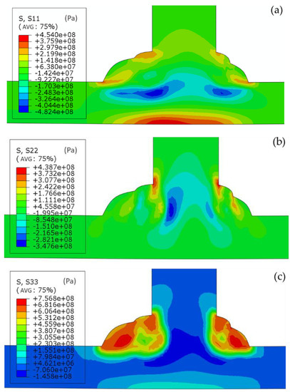 The residual stress calculation results are shown in Figure 9. The maximum value of the radial residual stress (S11) is 454 MPa, which is located at the tank bottom. The radial residual tensile stress at the discontinuous joint between the weld and tank bottom is 343 MPa, and the corresponding compressive stress is formed in the interior of the tank bottom.