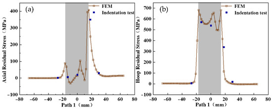 Residual stress distribution of path 1. (a) Axial residual stress, (b) hoop residual stress.