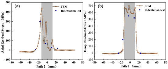 Residual stress distribution of path 2. (a) Axial residual stress, (b) hoop residual stress.